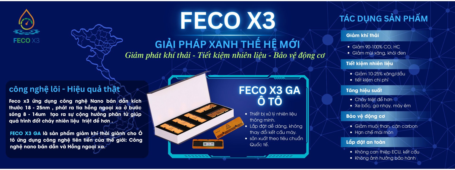 Công nghệ Nano Bán dẫn đột phá thế kỷ 21. Feco X3 giúp giảm tới 90-100% khí thải độc hại.